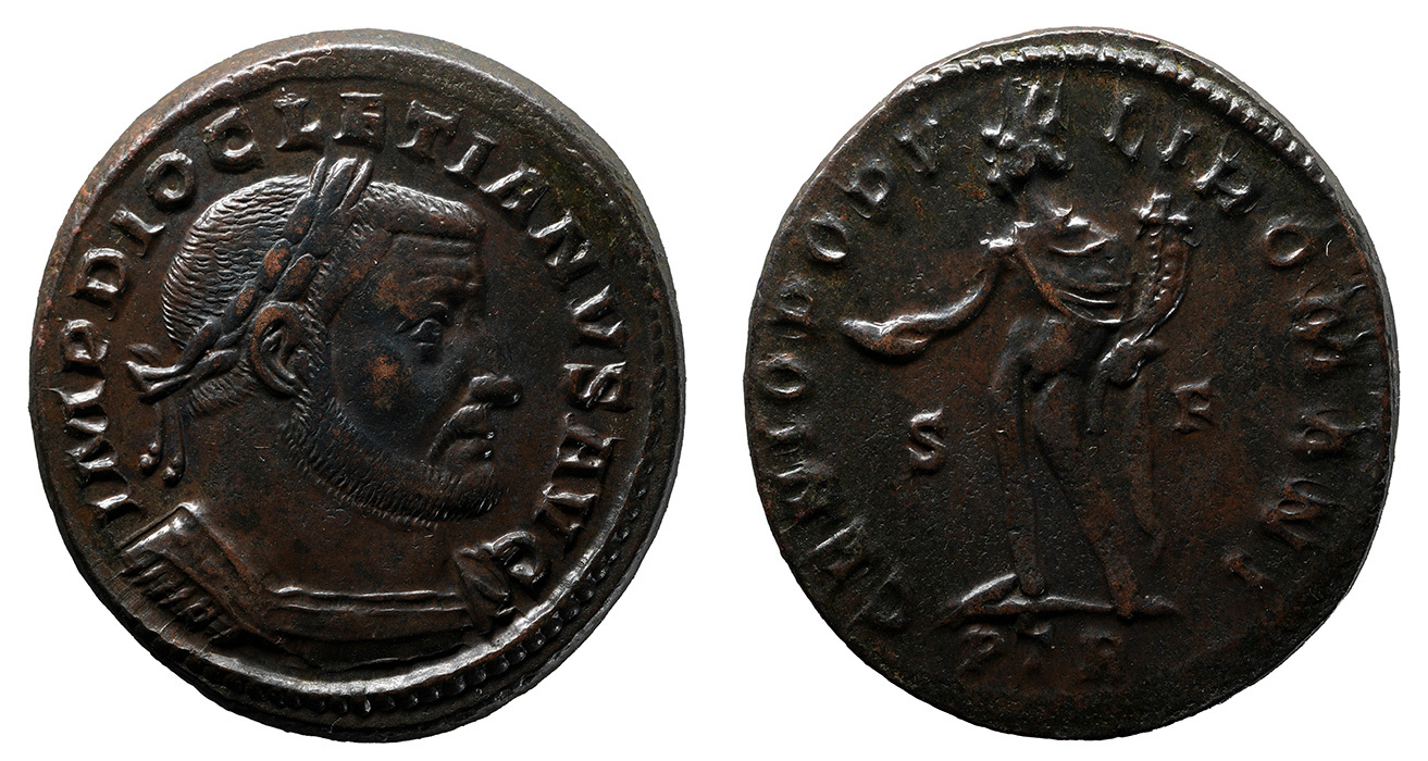 Obv: IMP DIOCLETIANVS AVG, Bust of Diocletian, laureate, cuirassed, right