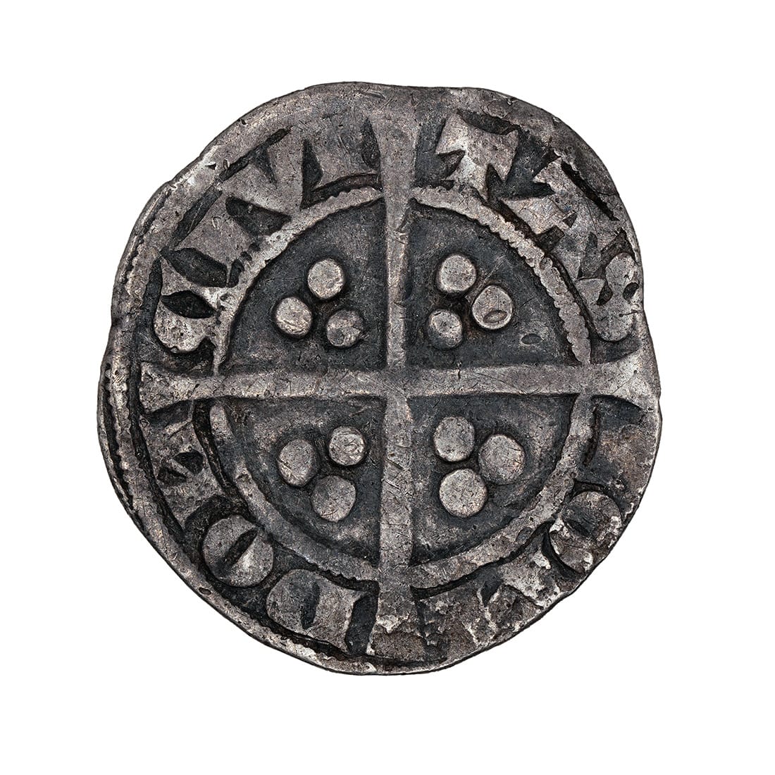 Long cross pattée, trefoil of pellets in angles, mint name around.