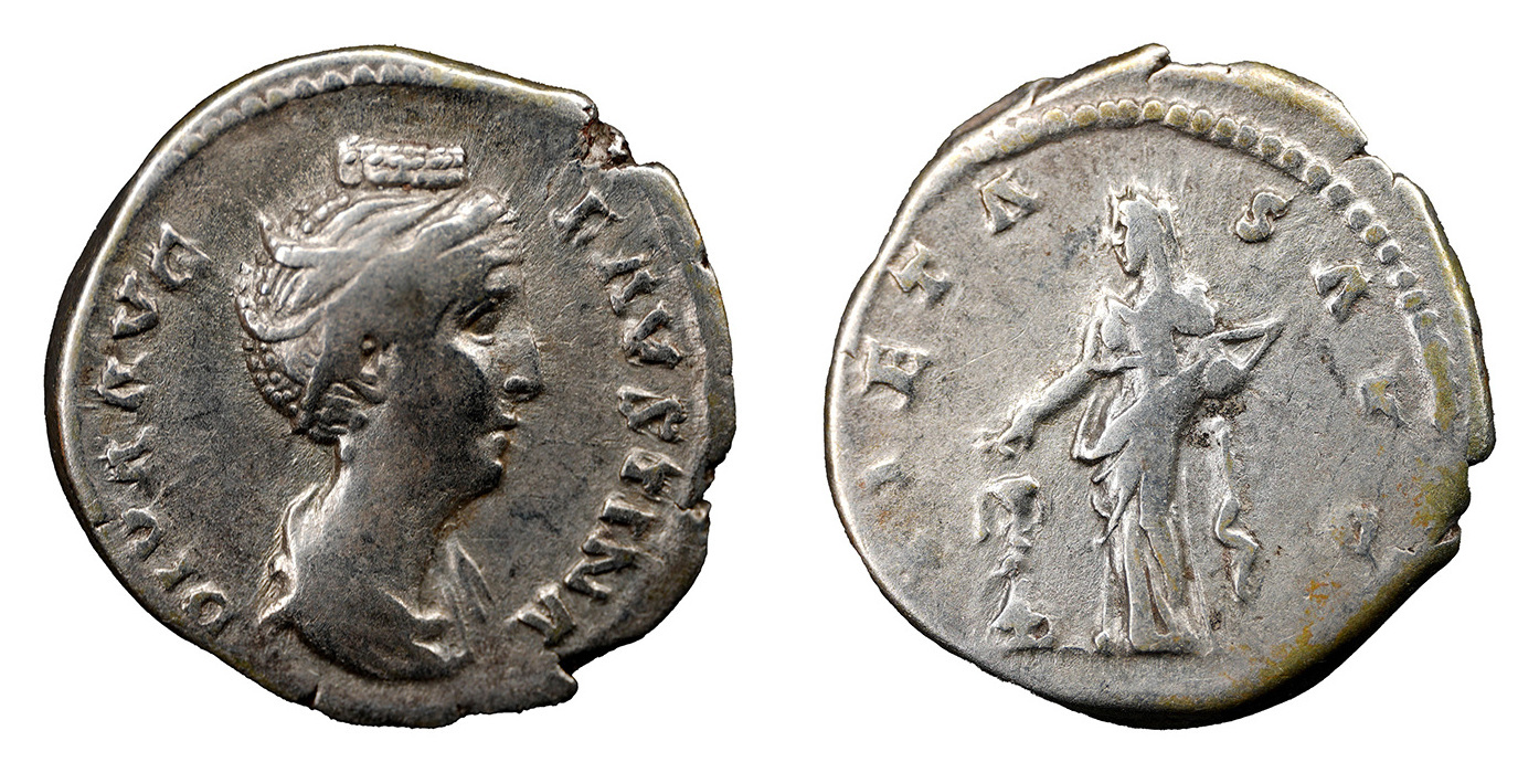 Obv: DIVA AVG FAVSTINA, Bust of Faustina the Elder, veiled, draped, right with hair elaborately waved and coiled on top.