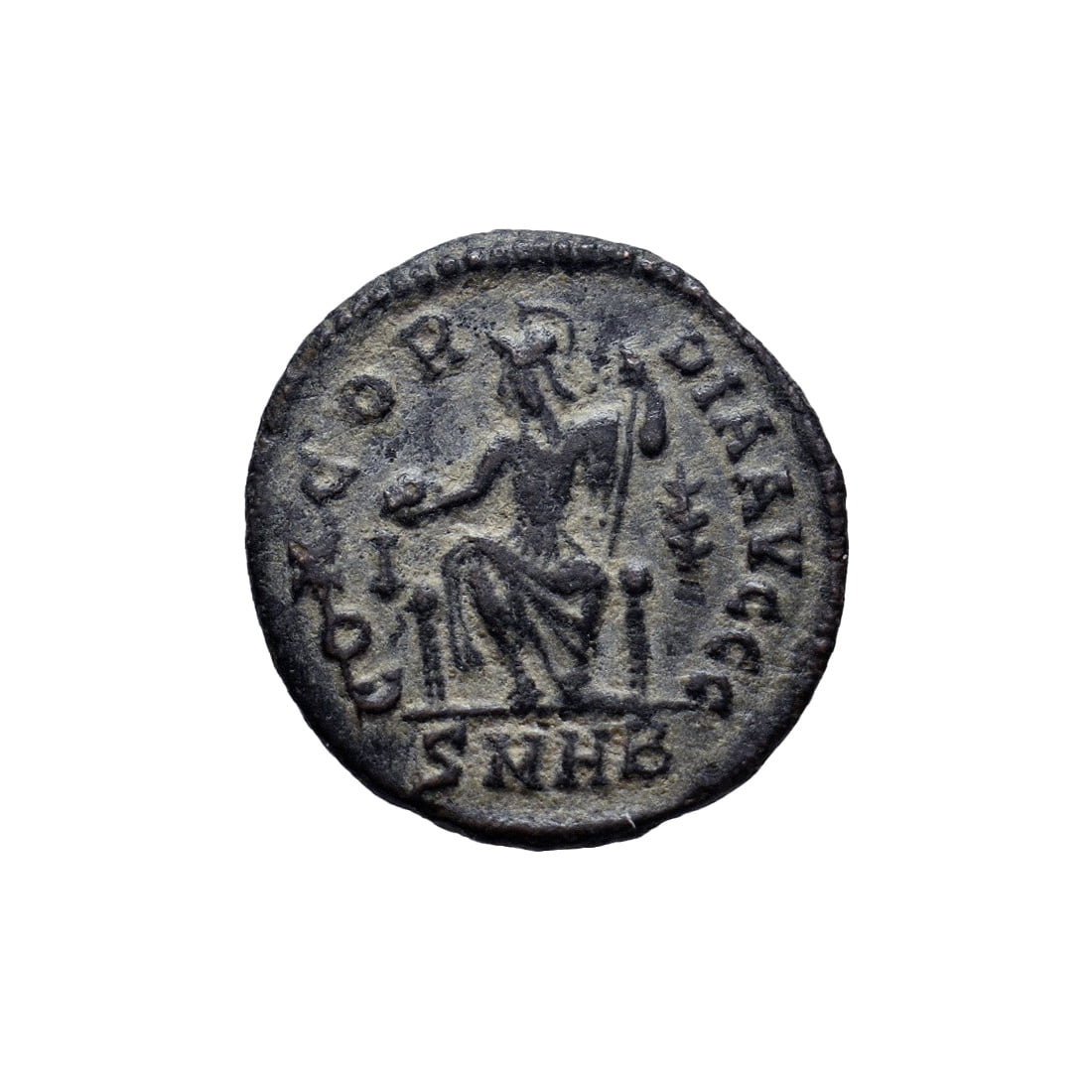 Rev: CONCOR-DIA AVGGG, Roma, helmeted, seated facing, looking left, her right leg bare, holding globe and spear, its lower part hidden by her robe. I in left field, upright palm branch in right field. Mintmark SMHB.