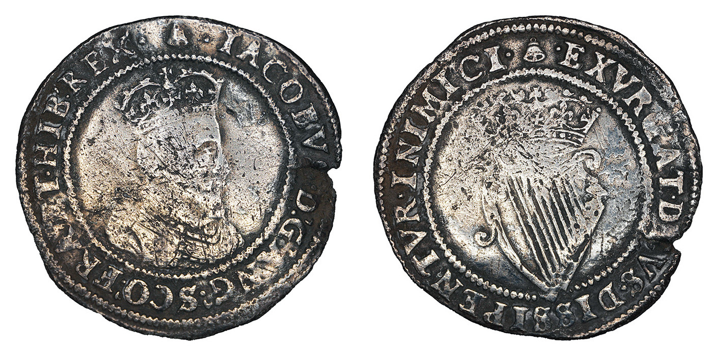 The first issue of Irish coinage under James I of England was initially struck in London because Ireland lacked a fully operational mint at the start of his reign.