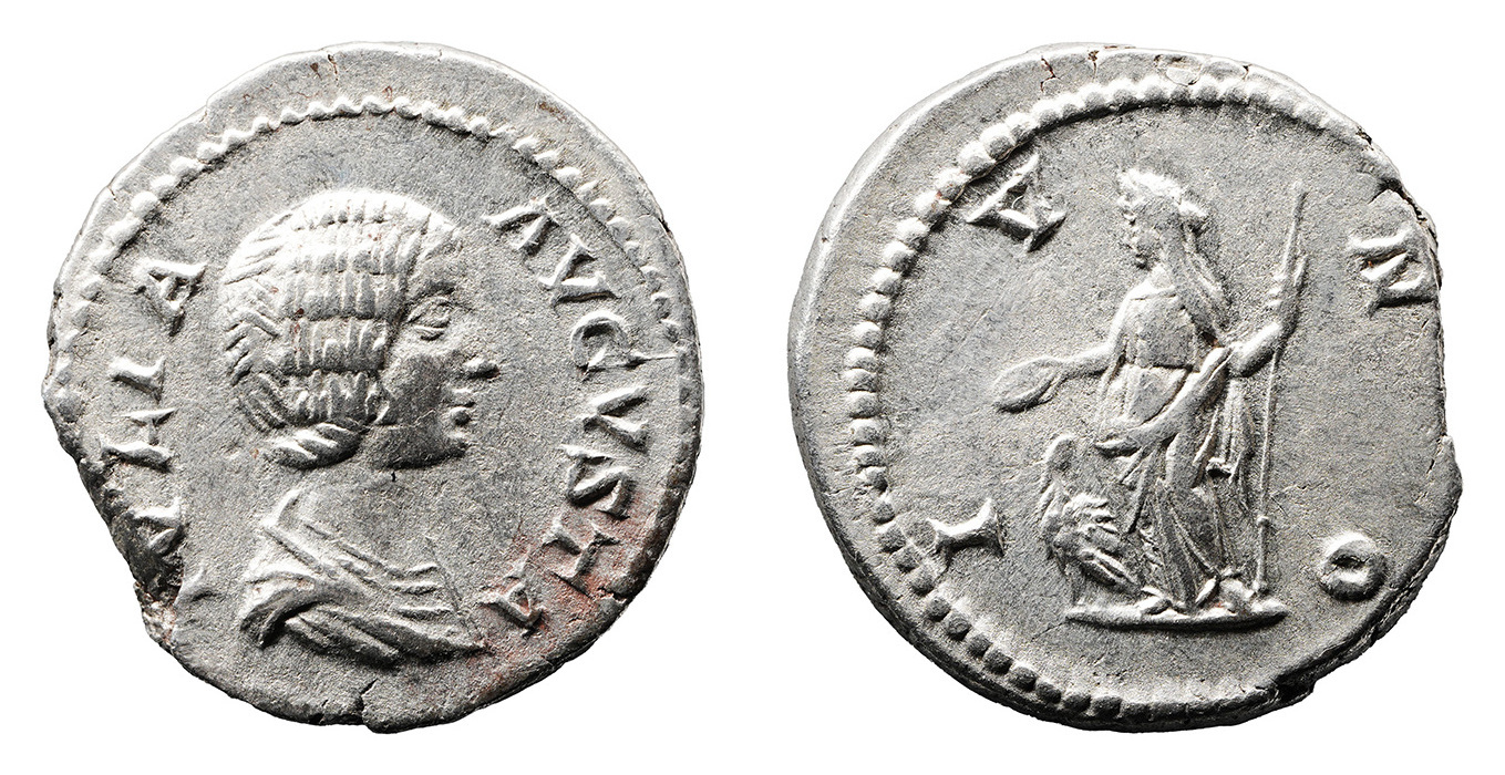 Obv: IVLIA AVGVSTA, Bust of Julia Domna, hair waved and coiled at back, draped, right.