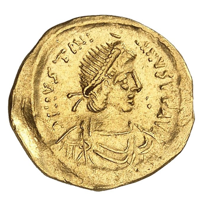 Obv: DN IVSTINI-ANVS PP AVG, pearl diademed, draped, cuirassed bust right