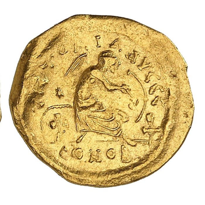 Rev: VICTORI-AAVCCC,Victory seated right, inscribing numerals on shield set on kneestar to left; star to left; reversed chi-rho to right; mintmark CONOB.