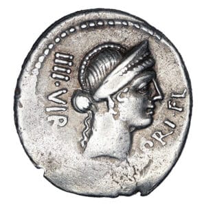 Obv: Diademed head of Venus right, IIII VIR behind, PRI FL before