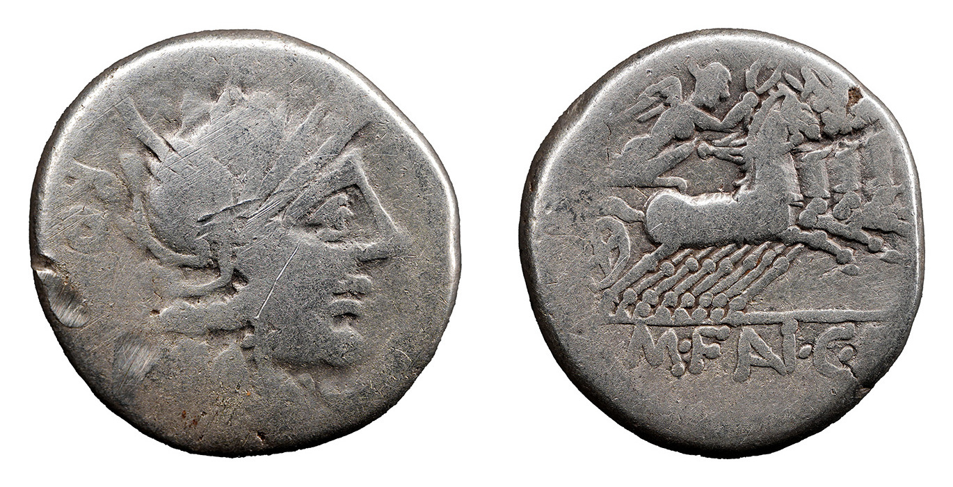Rev: M·FAN·C·F, Victory in quadriga, right, holding reins in left hand and wreath in right hand. Line border.