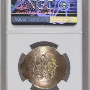 Rev: MANOVL to left, O-QE-O-W-P-O-S to right, of Manuel, bearded and wearing crown, divitision and loros, and St. Theodore, bearded and nimbate, wearing military dress, both standing facing, each holding swords, and together holding a patriarchal cross between them with large globe at base pellet on cross shaft.