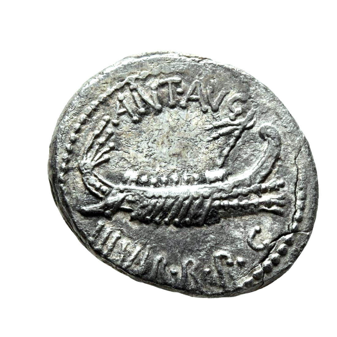 Obv: ANT•AVG•III•VIR•R•P•C Galley right, with scepter tied with fillet on prow.