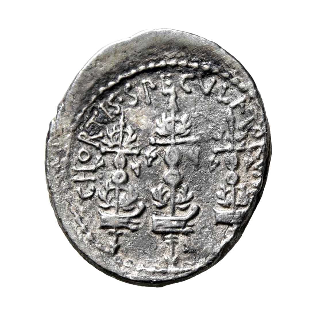 The ‘Cohors Speculatorum’ was a special army unit created by Antony, consisting of the so-called speculatores, men who served as spies, scouts, messengers, and explorers. Normally, each legion had ten such speculatores, but by forming a separate cohort, Antony had a cadre of such men at his direct disposal, no luxury in times of bitter civil strife. The function continued to exist under the Empire, where the speculatores served as messengers and bodyguards to Rome’s emperors and generals. Curiously, the aquilae on the reverse of Antony’s denarii are decorated with wreaths and prows. The latter in particular may refer to their task of manning the turrets on war galleys as lookouts.