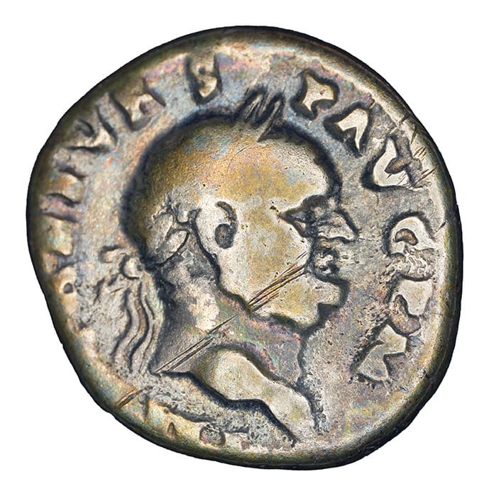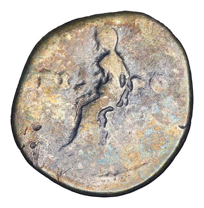 Vesta, draped, seated left, holding simpulum in extended right hand, left hand at side